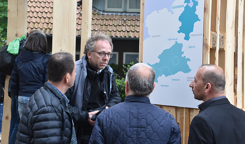 Direkt neben der Überwasserkirche präsentieren sich die sechs Regionen des Bistums mit Ständen. Das Grundmuster ist immer gleich, als Baumaterial dienen einfache Holzpaletten. Bei jeder Region steht ein Turm, mit etwas Phantasie bildet er das untere Stockwerk eines Leuchtturms. Wer hineingeht, hört akustische Kostproben aus der Region. Für das Oldenburger Land sind es Möwen, Szenen vom Stoppelmarkt und von einem Bauernhof. Genug Anregungen, um über die Region zu reden. Dietmar Kattinger, der Auskünfte über das Oldenburger Land gibt, bleibt jetzt jedoch mit seinen Besuchen vor der Karte des Offizialatsbezirks hängen. Die drei Männer stellen sich als irakische Christen vor, und sie wollen viel über die Kirche in der Region wissen. Dann aber fangen sie selbst an zu erzählen.