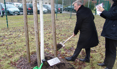 Als Nummer 354 pflanzte jetzt Weihbischof Theising einen Amberbaum, wobei ihn das regnerische Wetter bei der Arbeit unterstützte. Eine Patenschaft kostet 500 Euro, bezahlt werden davon der Kauf des Baumes, die Pflanzung, die Anwachspflege und das Schild mit Informationen zum Paten. Als Zeichen ökumenischer Solidarität verdoppelte Theising die Summe, wodurch er einer unvermögenden Gemeinde die Teilnahme an dem Projekt ermöglichte.